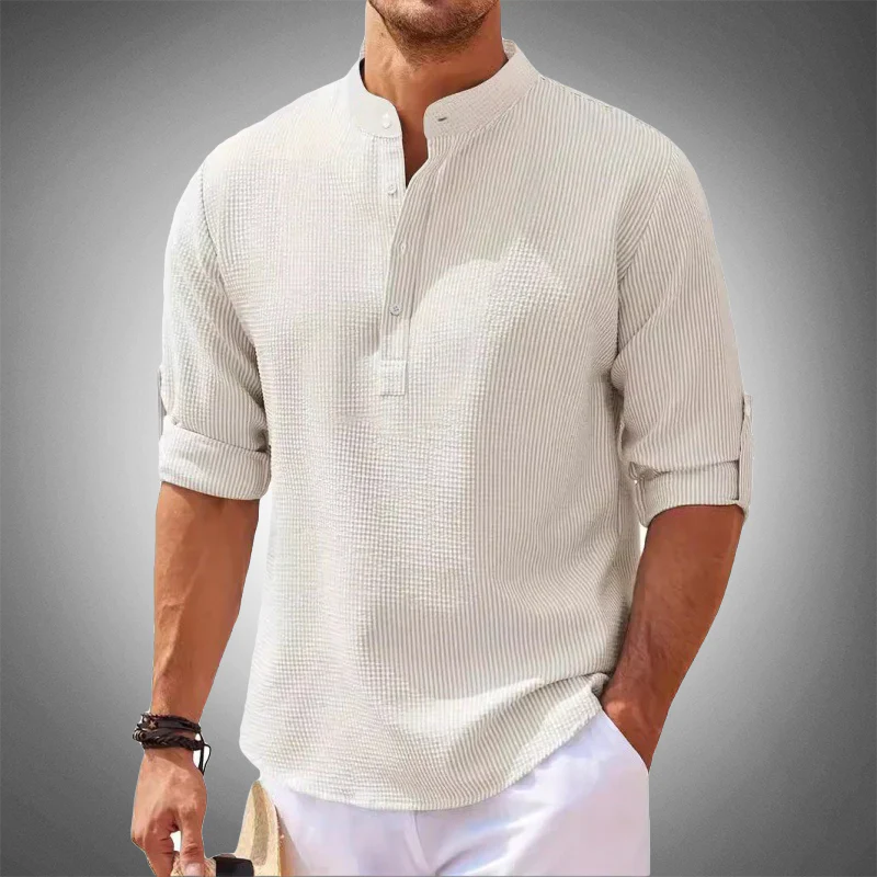 This shirt combines a premium feel with a smart-casual look, crafted from a breathable linen-rich blend to keep you cool and dry during the summer. Its waffle-knit texture adds a touch of sophistication, making it perfect for any social outing.