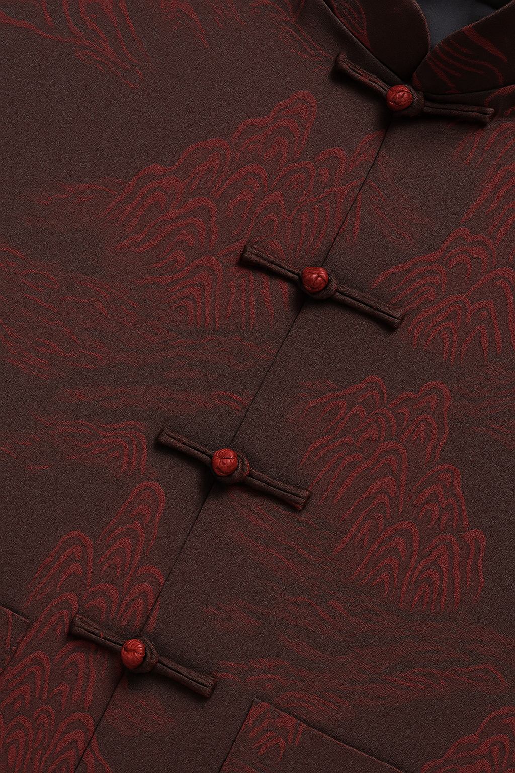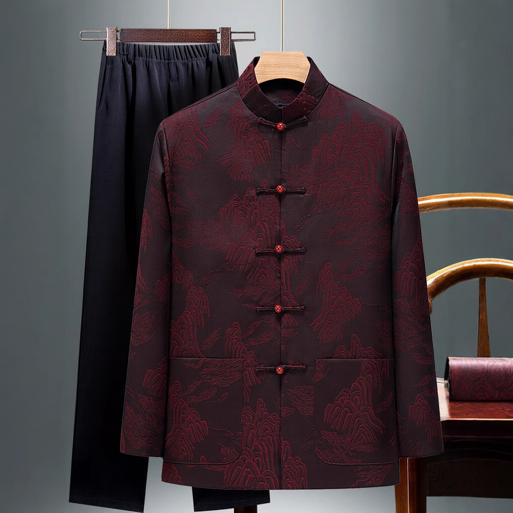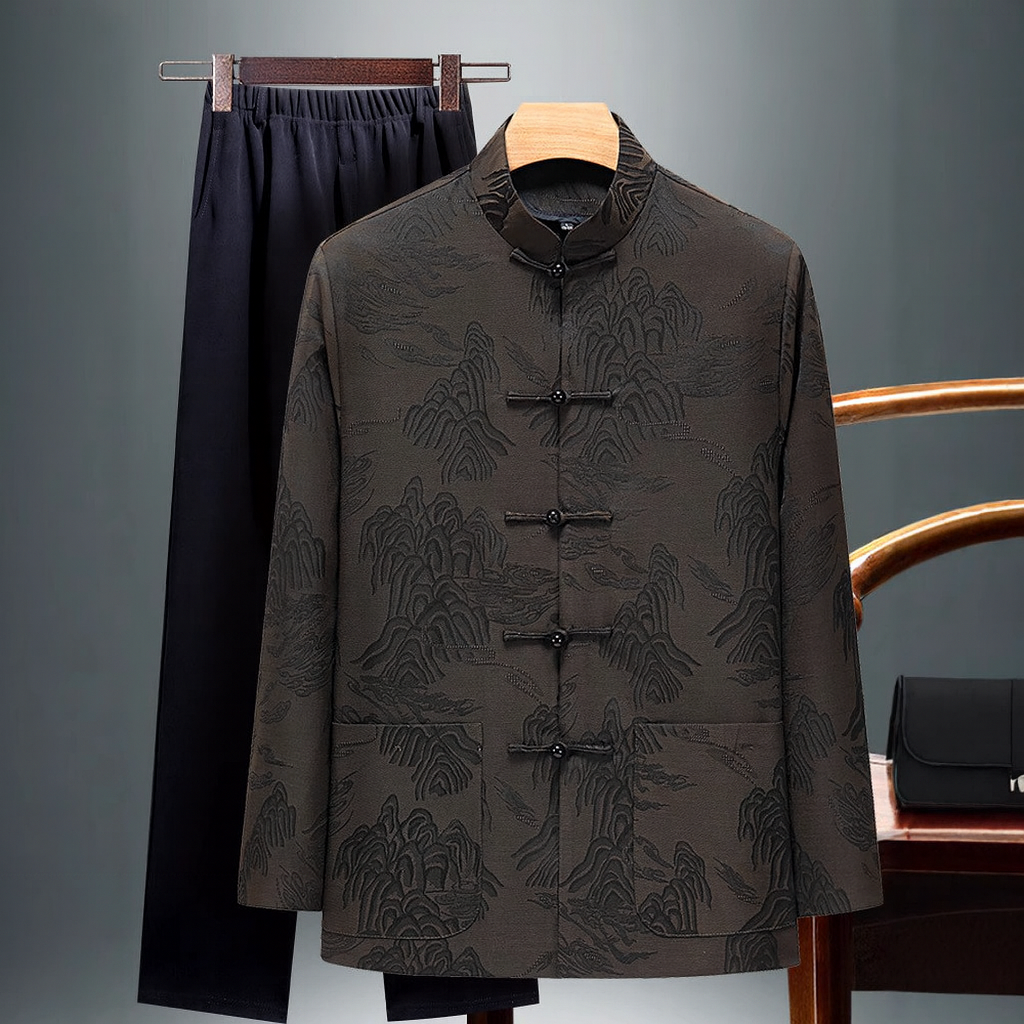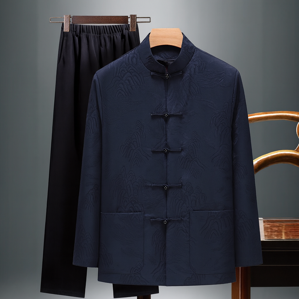 Crafted from a soft silk-blend jacquard, this set features an embossed mountain-inspired weave that catches the light with every movement. The knotted button closures and relaxed silhouette bring a touch of tradition to everyday ease.