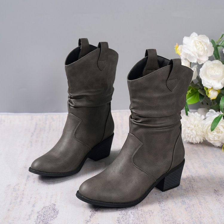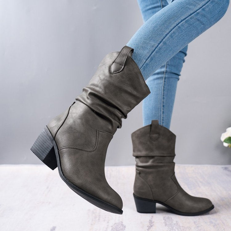 Add a touch of the Wild West to your look with these rustic, cowboy-inspired boots. Crafted from premium vegan leather, they feature a casual slouchy shaft and a sturdy block heel, blending comfort with support for all-day wear.
