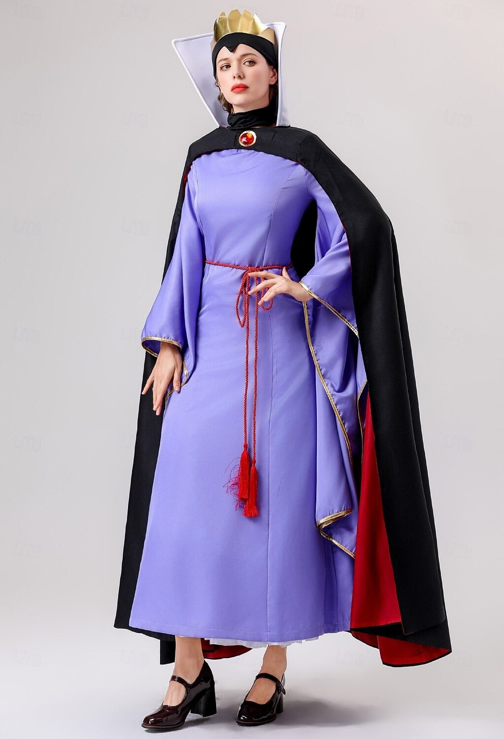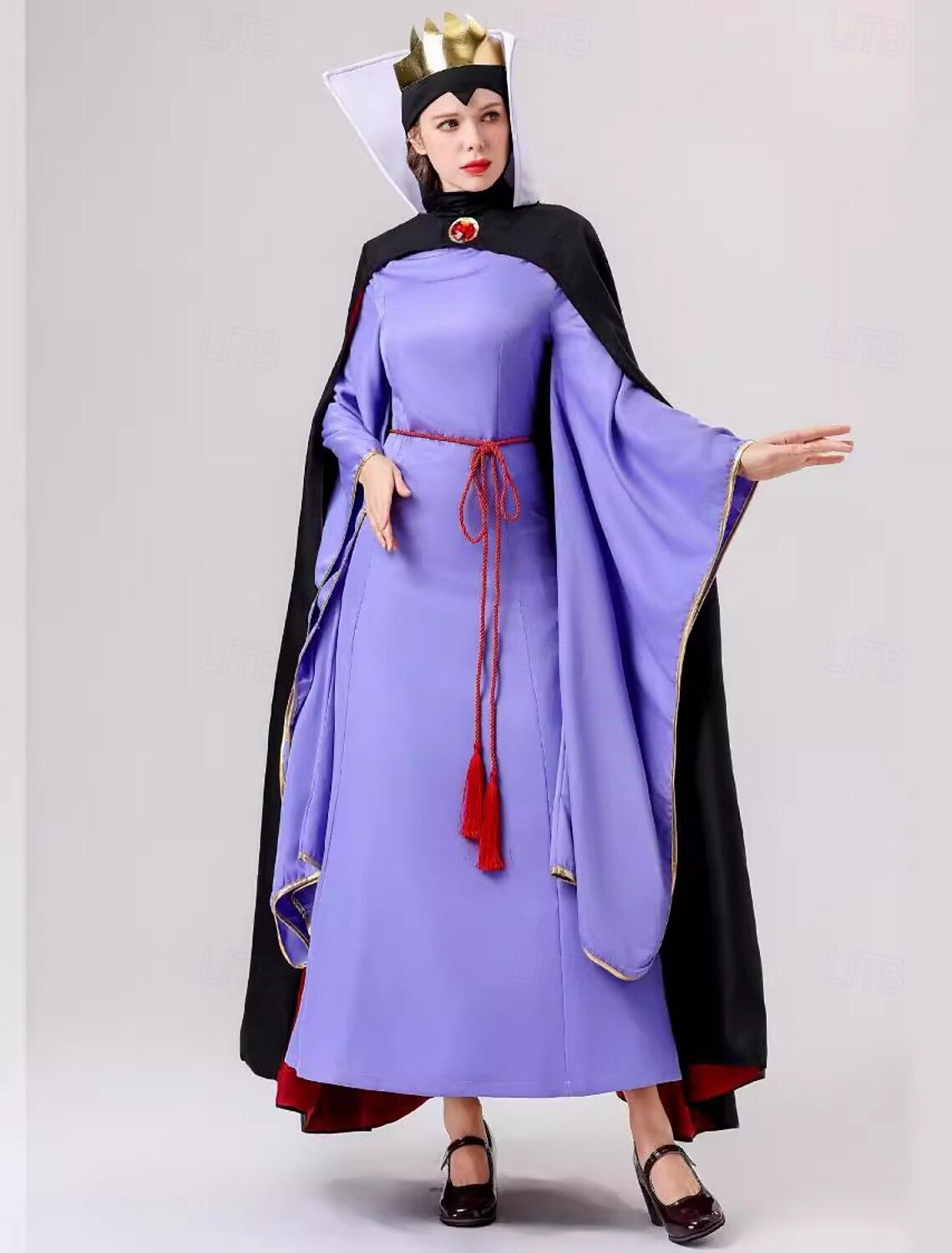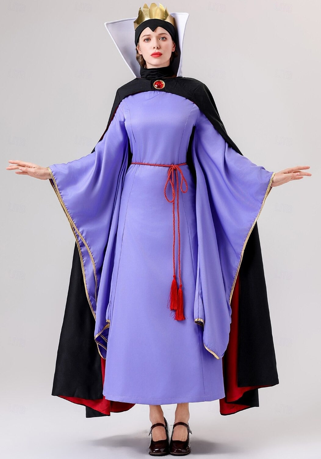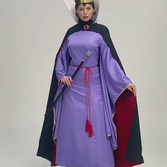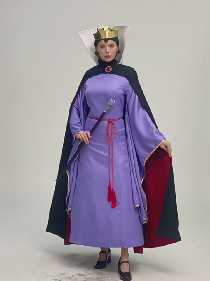 Rule the night with this satin-blend costume, where rich violet tones meet sweeping gold-trimmed sleeves and a red-tassel waist tie. Finished with a dramatic black cape, high contrast lining, and a sculpted crown, it’s made for the one who doesn’t just show up—but takes the throne.